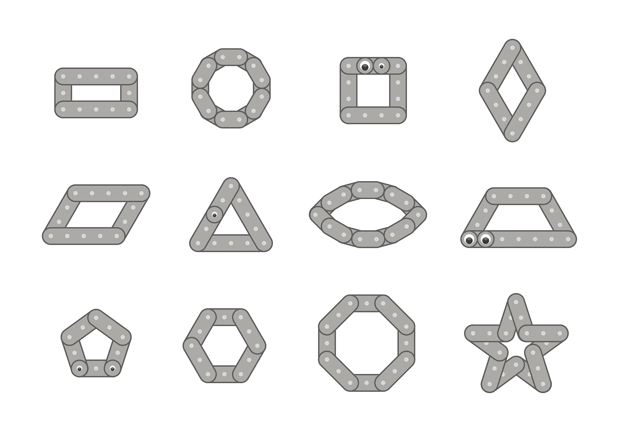 • No komplektā iekļautajām detaļām var salikt burtus, ciparus, ģeometriskas figūras, dzīvniekus,